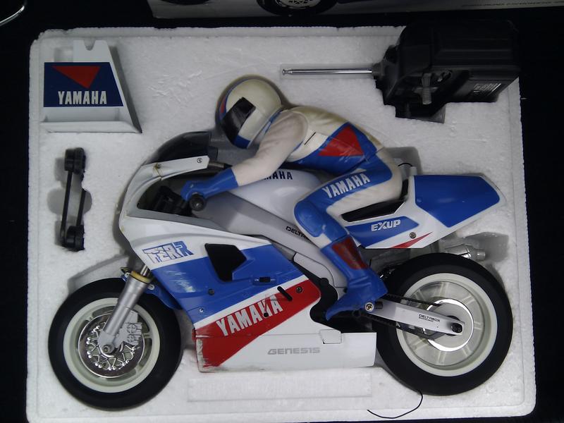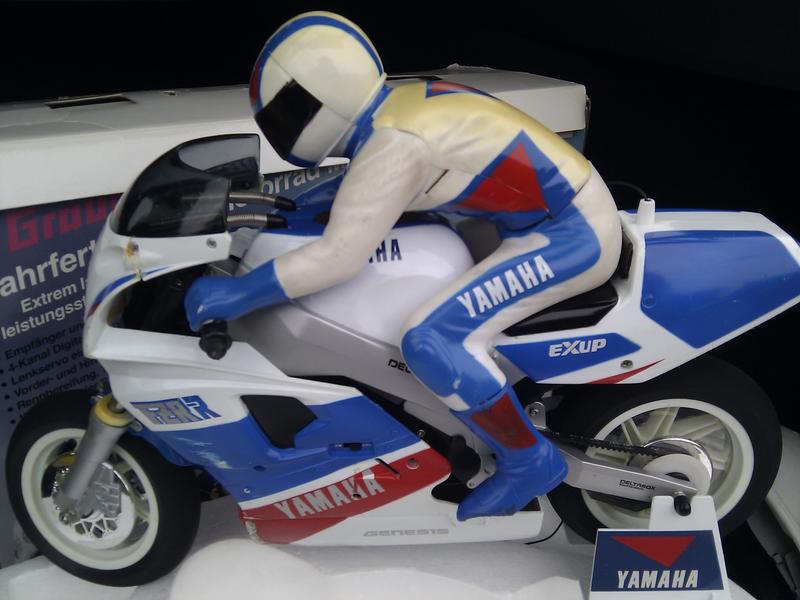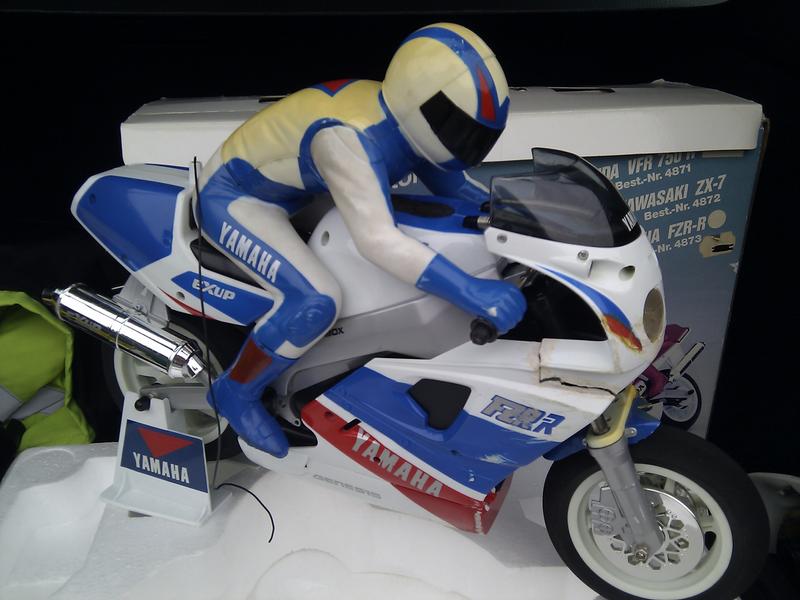 Verkaufe mein Graupner Yamaha FZR-R Modell von 1991. Technik funktionierte bis zum Schluss. Karosserie sollte instand gesetzt werden!! Es handelt sich hierbei um ein RTR-Modell: also Fahrzeug mit Fernbedienung. Es wird lediglich ein Akkupack benötigt und die Batterien für die FB