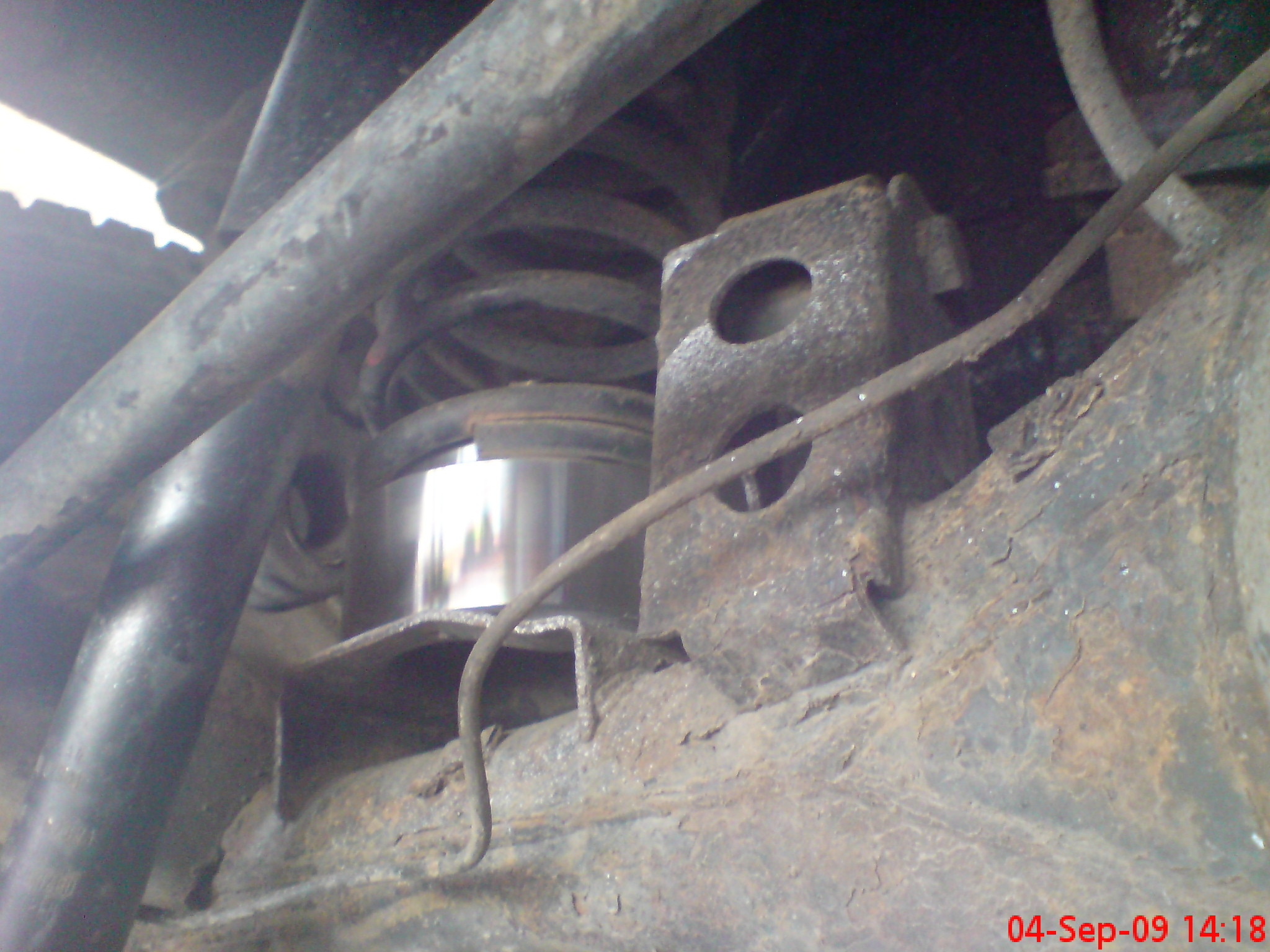 Alu-Spacer (hab ca.25mm-30mm) is fest mit einer 4mm Gegenplatte am oberen Rahmenaufnahmepunkt verschraubt. Also der Spacer bleibt da wo er hin soll und verrutscht nicht. Einfach gesagt, der Spacer hat die gleichen originalen Maße wie die eigentliche serienmässige Federaufnahme nur etwas nach unten gezogen
