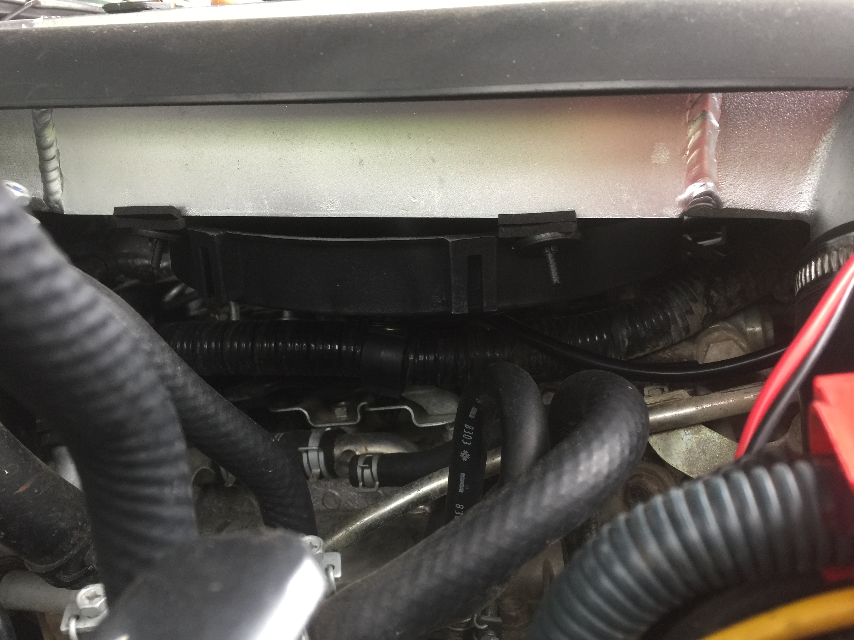 Bild 2471 zeigt den neuen LLK aus dem Land der Sonne, deutliuch schwerer und die Kanäle sind breiter, so dass die Luft besser durchstömen kann. Mein Aklter war ja geplatzt. Verbaut wurde noch ein Lüfter der unten dranhängt. Auch diesen haben Mao´s Erben gefertigt. Der läuft zur Zeit immer, so bald "Zündung" an ist.
