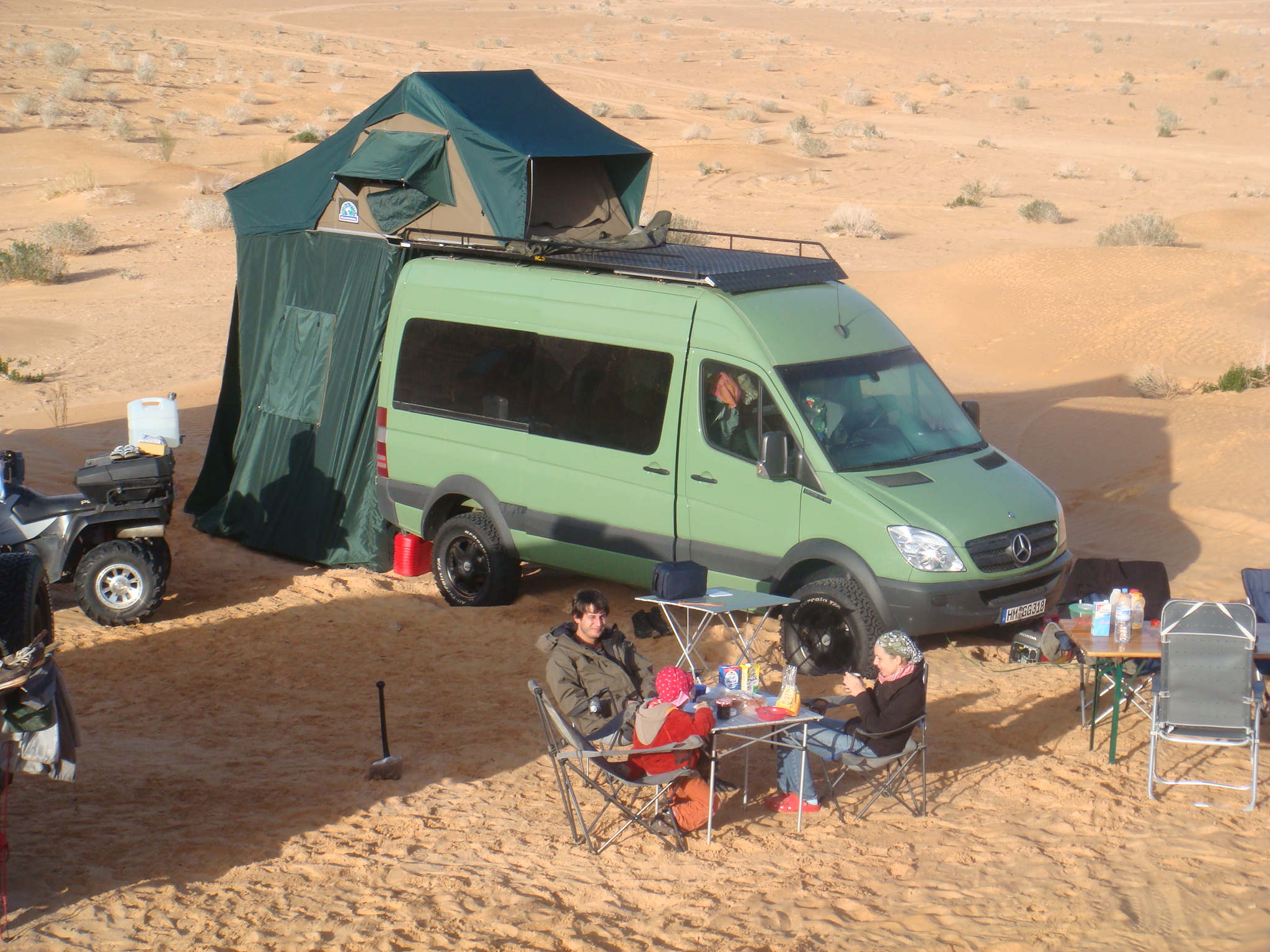Habe auf meinem Sprinter einen Dachträger in Schwarz. Er ist mit Alu Riffelblech belegt. Im Hinteren Bereich hat er ein Hannibal Dachzelt 240X140 cm in gutem Zustand. Dazu noch ein Hinterzelt, weil ich es über das Heck des Sprinters raus ausklappe.