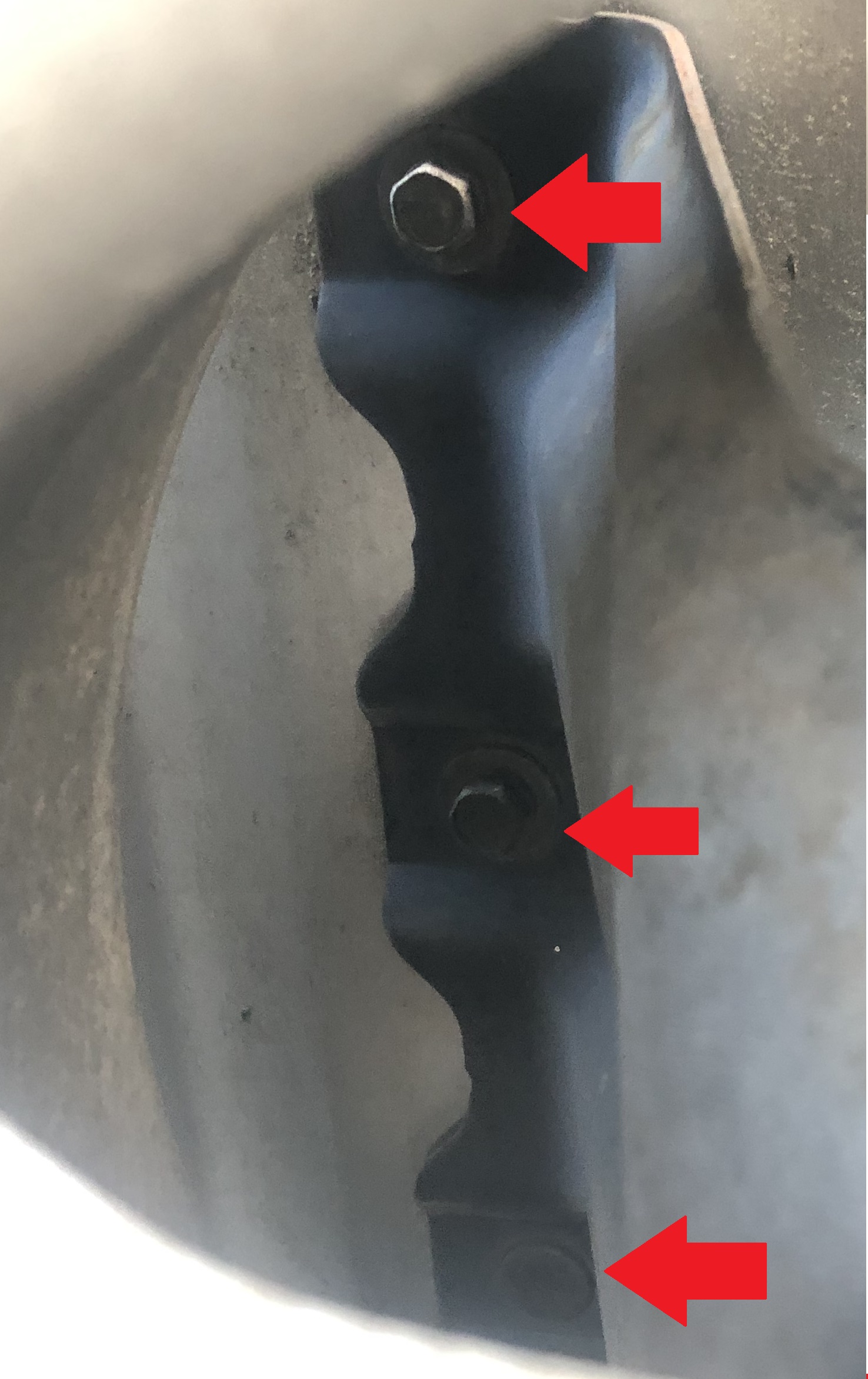 Meine Frage: Weiß jemand, wie die Bolzen gekontert sind? Ich habe mal in die Verkleidung abgenommen (siehe Bild), aber dort, wo sich die Bolzen (bzw. Muttern zum Kontern) des Trägers befinden würden, ist ein Doppelblech. Auffällig ist auch, dass der unterste der 3 Bolzen je Seite keinen Schraubenkopf hat (siehe Bild unterster Pfeil) - wie würde man den entfernen? Von der Innenseite sehe ich immerhin eine Mutter (siehe Bild), die wohl an der Stelle platziert sein müsste.