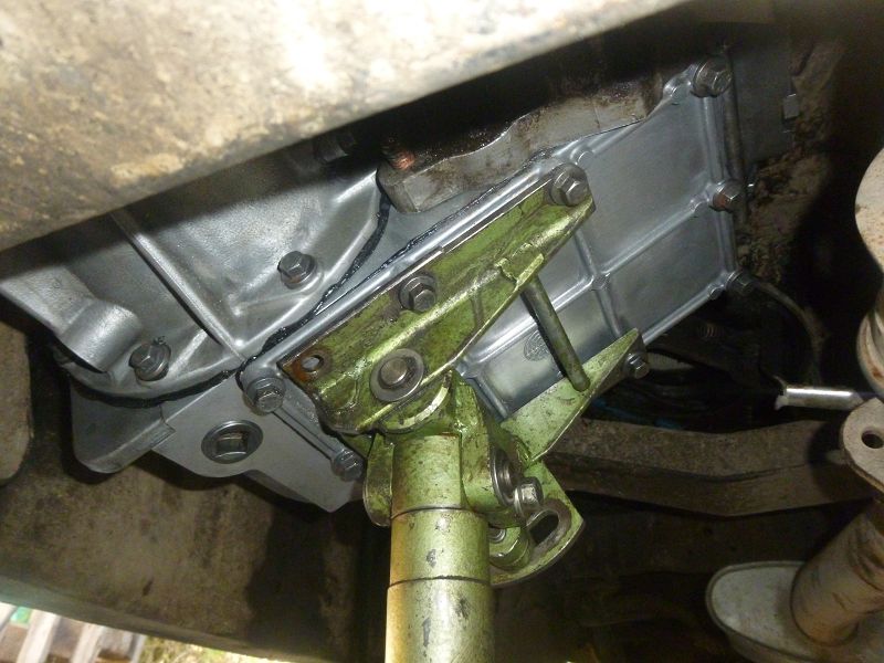 Das Schaltgetriebe ruht aufgebockt durch einen Klotz auf der Getriebetraverse!