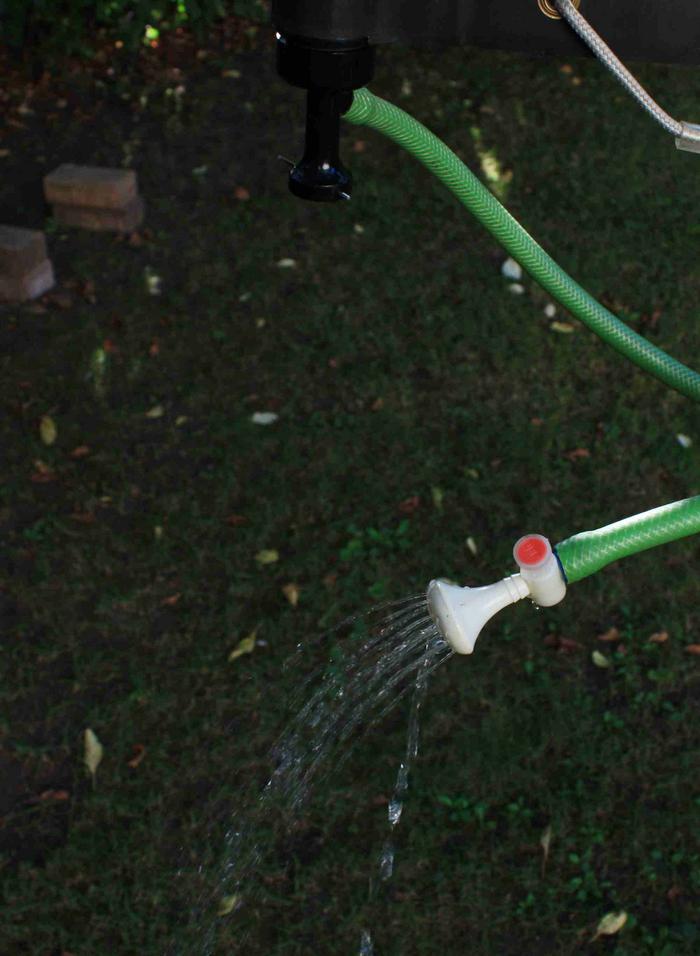 Den Schlauch über die eine Öffnung schrumpfen (Schlauch in heißem Wasser dehnfähig machen), sichern mit der Schlauchschelle und Schlauch so lang lassen wie gewünscht. Am anderen Ende des Schlauchs eine Gardena Kupplung montieren und daran dann die Dusche. ggf auch eine zweite Kupplung gleich hinten an der kleinen Wassersacköffnung montieren. Dann ist der Schlauch nicht immer mit dran.