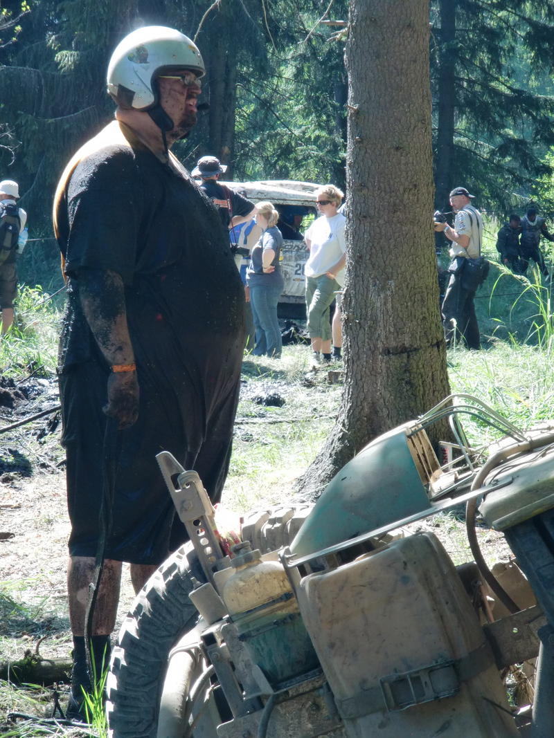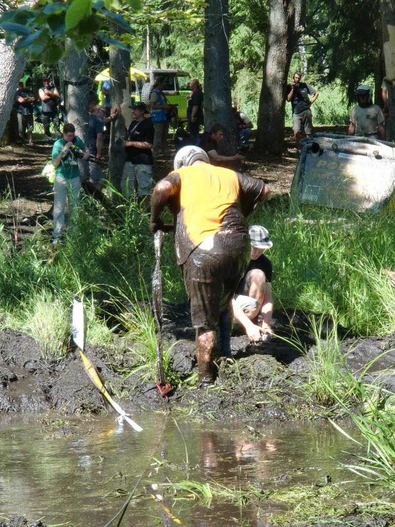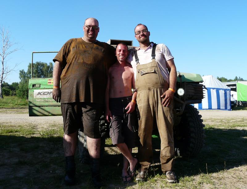 Los gehts, die Countdown-Uhr zählt runter und genau im Moment der Nullzeit, beginnt Patrick mit der Beschleunigung des Fahrzeugs. Einige Meter später erreichen wir den ersten Querweg, dem wir rechts folgen. Ich Nulle den Teilstreckenzähler und wir fahren weiter. Schon nach kurzer Zeit treffen wir auf einen Kompasskurs und wiederum kurze Zeit später erreichen wir das Ende jenen Kurses an einer Art Bunker. Es geht zügig weiter, da sich in unserer Nähe schon etliche Fahrzeuge befinden und wir bei den nächsten Hindernissen selber nicht weit hinten sein wollen. Das erste kleine Wasserloch war dann auch schnell gefunden und ebenso einfach genommen. Das Zweite kam uns dahin gehend sogar extrem bekannt vor. Hier hatte sich Patrick 2006 in großartiger Manier seine Brille an meinem Shirt gerinigt. Achja, das waren noch Zeiten. Wir wollten einfach durchfahren, das könnte ja nicht so schwer sein. Hätte, könnte, sollte, müßte - Fürn Arsch! Mittendrin, statt nur dabei, begann unser Antriebsstrang mit fremdartigen Geräuschen und Rucken. Alles knackte und zuckte. Patrick und ich sahen uns an und ohne das ein Wort fiel, war ich schon raugesprungen, um vom folgenden CP die Auszeichnung für unser Lebenswerk in Empfang zu nehmen. Doch der CP weigerte sich und legte uns nahe, doch erstmal das Loch mittels zu verlassen. Zwar hatte sich hinter uns noch kein Stau mit pöbelndem Mob gebildet, der uns mit Fackeln in der Hand folgen würde, aber wir verließen die Grütze dennoch schnell und winchten uns aus der Fahrspur heraus an den Rand.