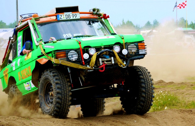 Bei der Startaufstellung ging uns wie üblich das Herz in die Hose. Um schnell zu sein, sollte man als erster vom Start weg kommen. Würde Lulu das schaffen? Wir starteten unsere Kameras in Heck und Front, warteten auf den Startschuss. Endlich war es soweit, die Startflagge fiel, Lulus Herz brüllte lautstark durchs Camp und ca. 3 Tonnen Metall ud Mensch setzen sich in Bewegung. Es dauerte nur wenige Sekunden, bis wir das Viererfeld anführten. Grafe gab alles und scheuchte unser Mädel (Lulu) mit Vollgas über den Parcours und so flogen und hopsten wir wie ein schwangerer Pinguin von Loch zu Loch, slideten auf glatten Beton um die Kurven und nach etwa drei Minuten war die erste Runde absolviert. Eigentlich ein doofes Timing, denn vor uns war nunmehr direkt die nächste Starteraufstellung losgefahren und direkt vor uns. Kein Pardon und 7 bar auf der Drucklufthupe sorgten dafür, dass wir auch diese vier Teilnehmer umgehend überholen konnten und nach vorne wieder freie Fahrt war.