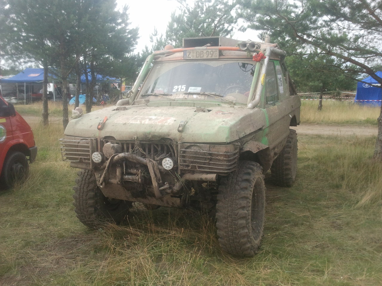 Bisserl aussichtslose Lage. Wir sammelten unsere Kräfte (an dieser Stelle ein dickes Dankeschön an den netten Fotografen für die Wasserflasche) und befestigten hinten unser statisches 12mm Dyneema bergeseil. Der rote Mog von Mutti Marino war zur Hilfe bereit und riss uns in etlichen Anläufen endlich raus. Bis dahin waren sicher anderthalb Stunden vergangen...Rein vom gefühl her. Wir umfuhren das Loch und bekamen abermals zwei Strafstunden. Und da wir keine Windenseile mehr hatten, ließen wir einen Moor-CP auch aus (wir wollten fairerweise nicht blind reinfahren und auf Frdmhilfe hoffen) - Nochmal zwei Strafstunden.