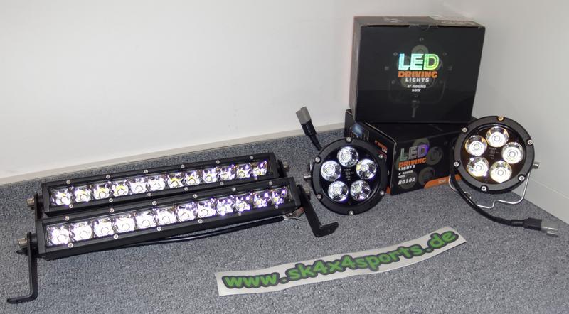 Zwei kleine 60W LED Lightbars als und zwei 50W LED Fernscheinwerfer mit E-Prüfzeichen - soll alles aufs Dach.