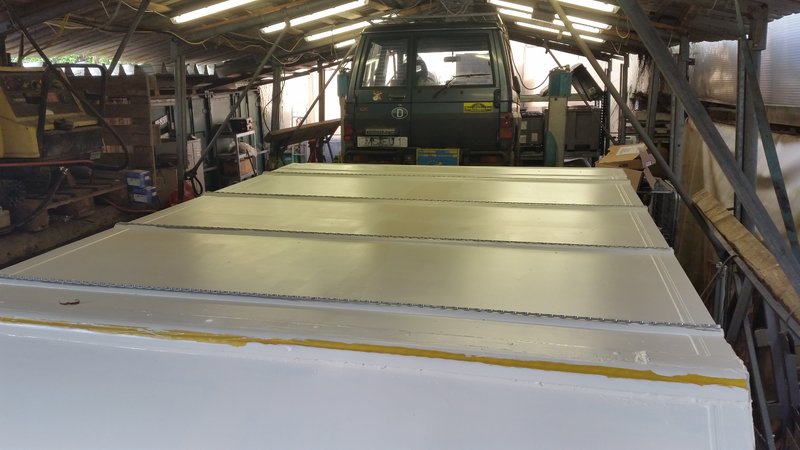 Kurzerhand wurde das Ding entkernt, geschliffen, Löcher zugemacht, gewalzt, Ecken verstärkt, Stirnwand verstärkt, Zurrschienen verklebt und Verschraubt, Licht montiert, Solar obendrauf, Markise dran, Kurbelstützen und Stützrad dran, Strom und Luft Verteilung montiert und auf die schnelle eingeräumt.