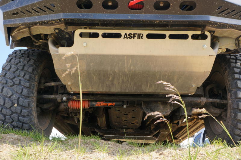 Ein Lenkungsdämpfer von Trailmaster kommt ebenfalls dazu. Und da wir ja schon unterm Auto liegen, montieren wir das Unterfahrschutz-Set von ASFIR für vorne, Getriebe und Verteilergetriebe: