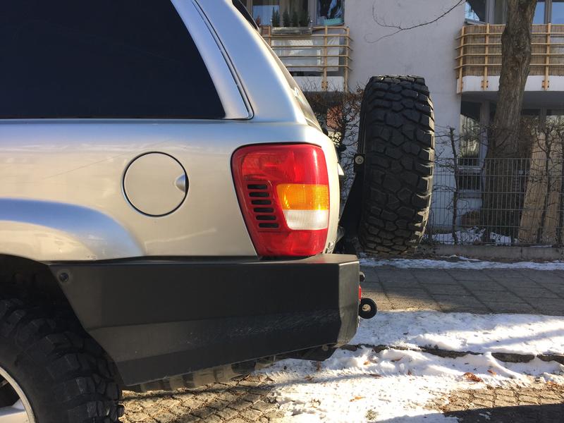 Auch nach hinten raus ist der Wagen nun etwas länger; weniger wegen der Stoßstange, sondern eher wegen dem überstehenden Reifen. Das macht das Rückwärtseinparken in der Stadt etwas spannender rotfl und der Reifen schränkt auch die Sicht durch die Heckscheibe deutlich ein, aber die Vorteile überwiegen deutlich: