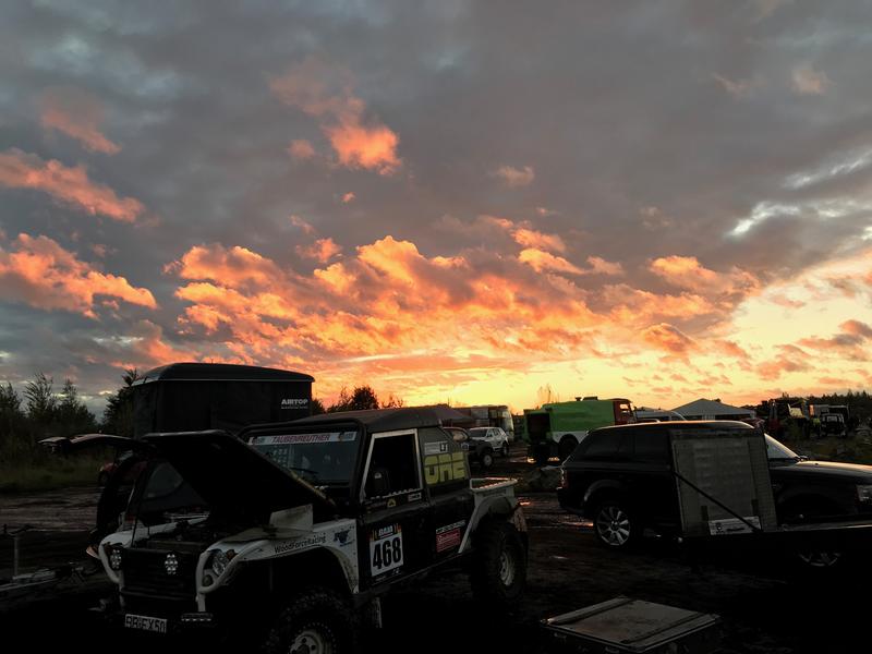 Irgendwann starten die SBS. Startsignal war eine Rakete, die ich nicht gesehen habe. Clemens hat sie gesehen und ich sage ihm er soll mir einfach sagen wann unsere Reihe startet. Es geht los aber wie gewohnt ist unser Defender aus dem Stand kein Beschleunigungswunder. Das muss ich dann eben auf der Strecke wieder rein fahren. Der Hammer waren die Funken die unter vielen Fahrzeugen raus kamen. Keine Ahnung was das war aber im Video sieht man es immer wieder ganz gut. Leider passen die Distanzen auf dem Tripmaster nicht und Clemens kommt damit nicht so richtig klar. Als dann eine ganze Gruppe falsch fährt, fahren wir hinterher und verlieren viel Zeit. Später löst sich mein Ganghebel und ich bekomme nur noch die Gänge 2,3 und 4 mit Glück rein. Irgendwann ist bei uns kein Licht mehr. Wir tippen auf Komplettausfall der Lichtanlage. Clemens hält seine Stirnlampe aus dem Fenster. Läuft. Immer wenn Wasser kommt nimmt er sie kurz rein. Geschwindigkeiten bis 80km/h gehen aber noch. Als wir uns nochmal verfahren bekomme ich ewig den Rückwärtsgang nicht rein. Der Ganghebel dreht sich immer wieder weg. Als wir dann endlich wieder auf dem rechten Weg sind und vor uns ein Wagen geborgen wird, laß ich Clemens doch mal vorne schauen. Alle Scheinwerfer gehen, haben nur so viel Schlamm drauf das man es nicht sieht. Clemens macht sie kurz sauber. Endlich wieder Licht. Durch den losen Ganghebel und die Verfahrer haben wir aber einiges an Zeit verloren und landen auf Platz 23.